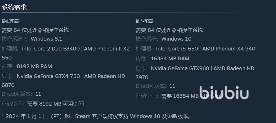 先来看最低的配置,处理器方面,Intel Core 2 Duo E8400或AMD Phenom II X2 550是最低标准,内存方面,8GB RAM是最低要求,显卡部分,Nvidia750或AMD6870能够支持游戏在低画质下运行。DirectX 11的支持是必须的,存储空间方面,8GB的可用空间相对较小。
