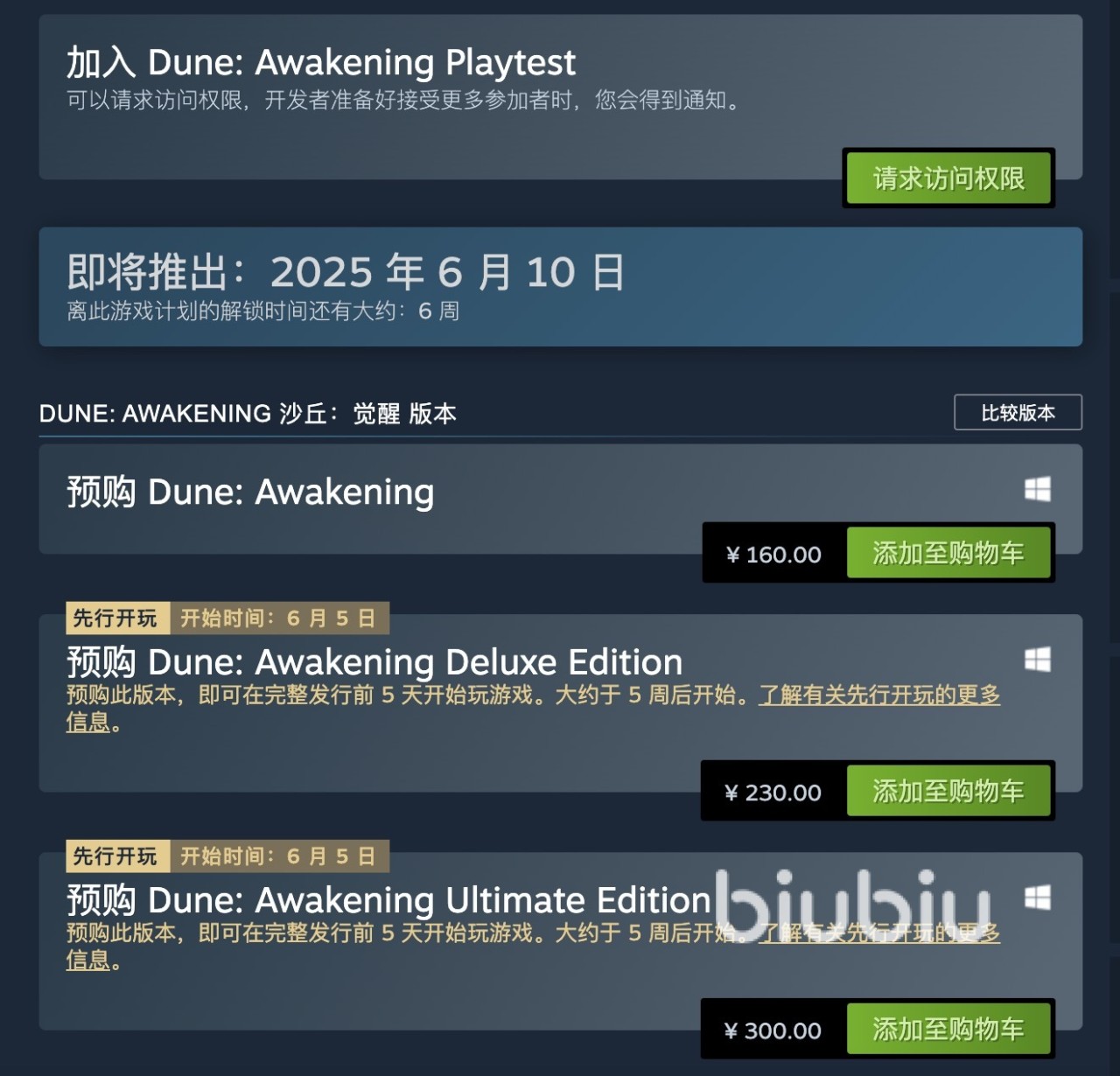 《沙丘:觉醒》的公测时间为2025年5月9日至12日,数万名玩家将化身「星际拓荒者」,直面动态沙暴、资源争夺与千人攻城战,正式上线时间定于2025年6月10日全球发布。如果玩家在Steam平台预购,可以在6月5日提前开始游戏。
