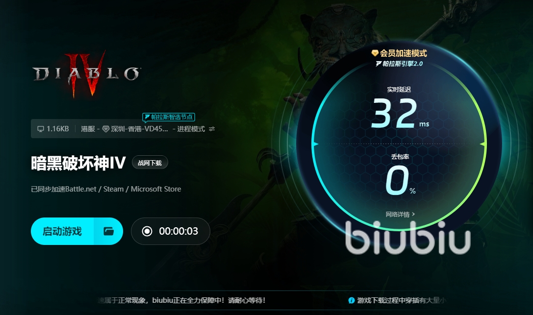 经过加速之后,我们的网络状况会稳定很多,丢包率在0就代表波动被控制住了,而且biu仔还为我们智能选取网络节点,所以一直是处于通畅的状态下,大家就放心去挑战高难boss吧,不用担心有闪退或者是卡顿了。