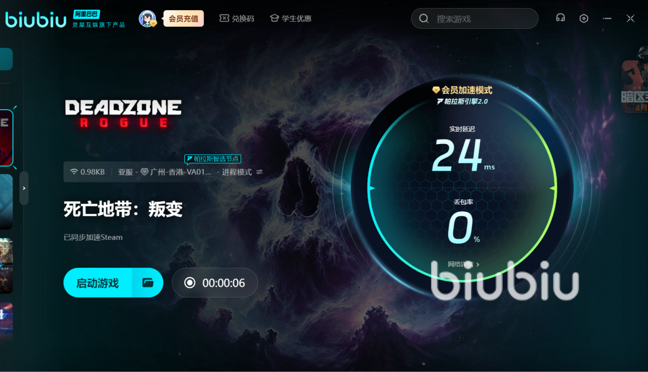 DeadzoneRogue作为一款玩法多元化的肉鸽闯关游戏,玩得太卡的话可能会让大家寸步难行。这里建议用上biubiu,加速后方可找准对手的弱点并将其击败。对于刚注册的新用户来说,可获得24小时的免费加速。新老用户通过兑换码【biubiu不卡顿】,输入后就能额外领取三天免费加速。不过在操作一些高难度的武器或者角色时延迟高,就无法发挥100%的实力。用上加速器后,就可实现高难度操作,并尽量减少失误,增加游戏过关率。