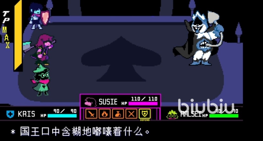 过上十来个回合,国王的血量见底之后,就会跪地进入对话环节,我们操纵主角选择给其安抚,就是饶恕了他。国王会偷袭我们,但是怪物王子挡在了前面,国王就住手了,结局达成。