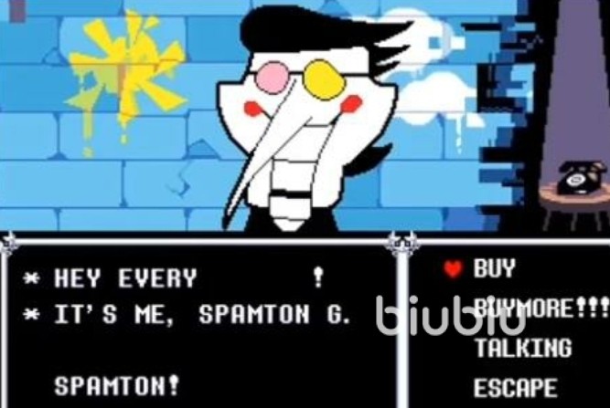 spamton曾经是电子城街头的一个推销员,尽管他努力推销商品,但由于运气不佳,销量一直不尽如人意。然而,某一天他得到了某种神秘的帮助,商品突然畅销,甚至惊动了女王。这一转变让spamton的事业达到了巅峰,但好景不长,这种帮助突然消失了,他的事业也随之迅速下滑。在绝望中,spamton发现了一个神器幻影水晶,这成为了他性格和行为的重要转折点。