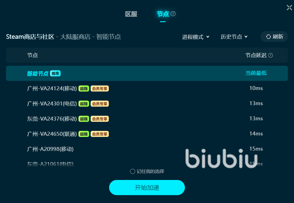 而且,biubiu针对Steam的加速服务目前正值限免状态。更方便的是,在安装包完整的情况下,你还能直接从biubiu加速器内一键启动《战争技师》,倘若遇到线路节点拥堵,你还能手动切换适合自身宽带环境的节点。