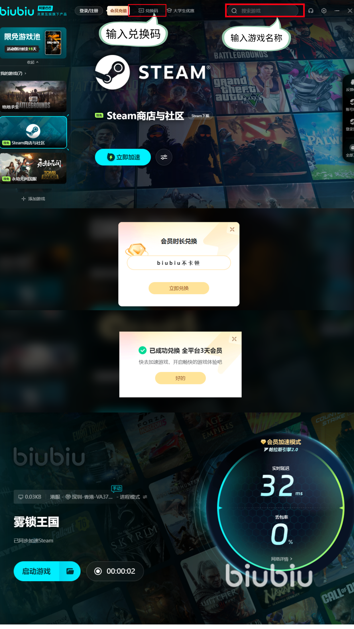 上方给大家带来了加速器的相关链接,小伙伴们在玩这个游戏的时候,由于经常进行探险,所以有的时候流畅的操作体验也是很重要的,可以通过加速器的辅助来让自己提升游戏环境,上方给大家带来的加速器不仅可以很好的帮助小伙伴们进行加速,还带来了很多的福利,比如新用户登录注册会有24小时免费加速时长,此外平台的每个小伙伴都可以用biubiu不卡顿兑换到手三天加速时间。