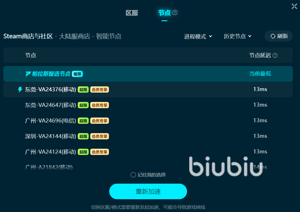 biubiu加速器的强大还体现在其丰富的资源与全面的服务上。它支持加速海量游戏,覆盖各大热门服务器,Steam平台的商店社区、跨区入库、远程同乐等功能均可轻松加速。遇到加速问题也无需担心,智能客服教你解决疑难。只需一键点击加速键,系统便会自动连接智能节点,无需繁琐操作,静待加速成功,即可开启高质量游戏对局。