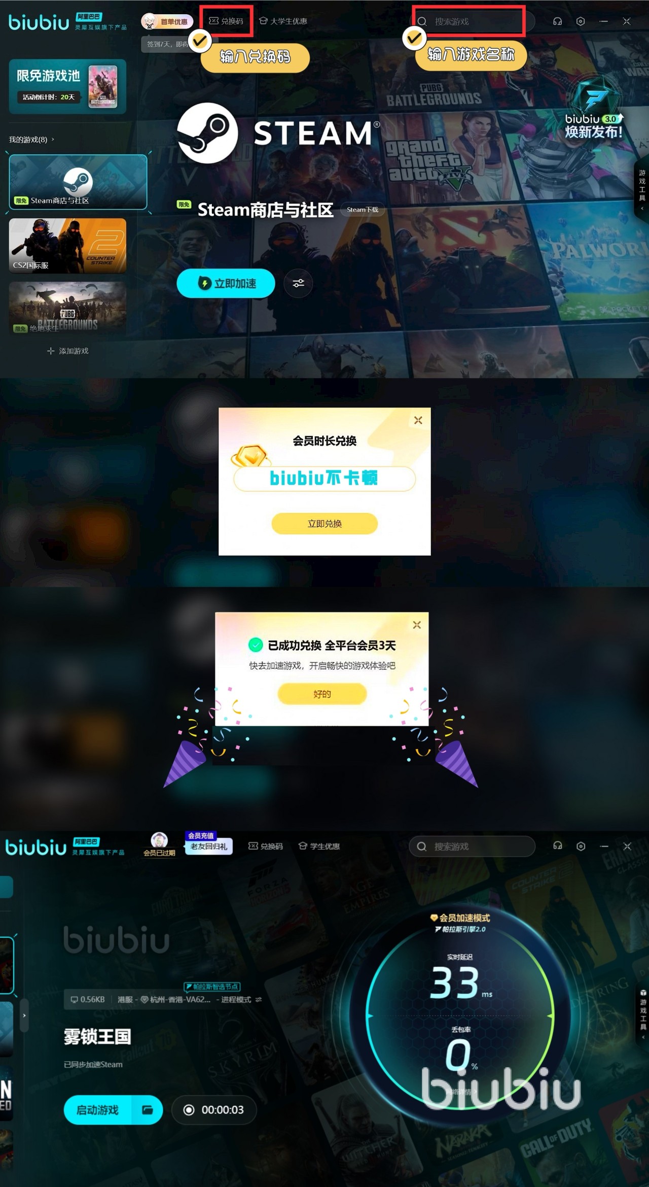 除了点数之外,技能也是决定玩家们职业强弱与否的重要参考标准,由于玩家们在前期选择了非常强力的敏捷属性,所以技能方面则可以选择【多重箭】这样拥有群体攻击效果的技能,另外【穿透箭】以及【爆头箭】也可以增加对敌方造成的伤害,减少战斗时间。在战斗的过程中,如果因为卡顿问题的出现导致战斗失利,确实是一件非常难受的事情。为了避免这种情况的出现,小编推荐大家使用biubiu加速器来为自己的战斗体验保驾护航。对于之前从未使用过biubiu的新手用户来说,简单注册后就可以获得24小时免费加速的新人注册福利,后续也能通过【biubiu不卡顿】来兑换3天的免费加速时间,这个兑换码无论是新老用户都能使用。