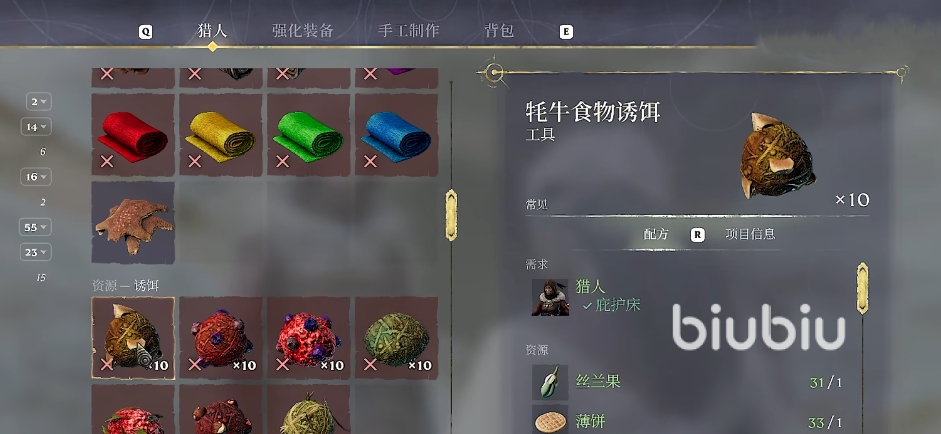 薄饼除了能用于果腹,同时也是制作牦牛食物诱饵的重要的材料,在制作牦牛食物诱饵上需要丝兰果、薄饼、玉米棒等基础资源制作,其中薄饼的需求是最多的。想要捕获更多的肉类就要尽可能多准备薄饼道具。