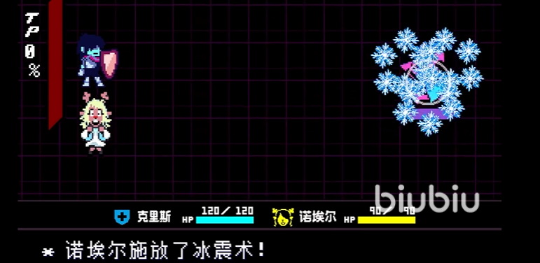 诺艾尔是克里斯的青梅竹马,其家庭背景(父亲重病、失踪的姐姐Dess)与“December”的隐喻(墓地线索、隐藏网页)暗示悲剧过往。在冰封线(Snowgrave Route)中,玩家通过操控诺艾尔施展“冰雪之墓”魔法,逼迫她冻结敌人甚至他们的好友鸟哥(Berdly),揭示游戏最黑暗的主题——无辜者的被迫堕落。这注定是一个悲剧,鸟哥也不会再活过来。