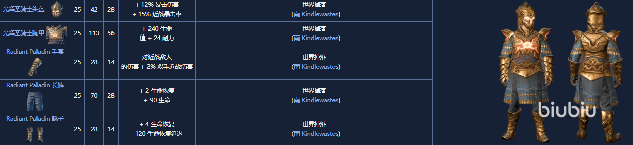 15. 光辉圣骑士套,25级,从南方 Kindlewastes 的可掠夺宝箱或 Boss中随机获得。