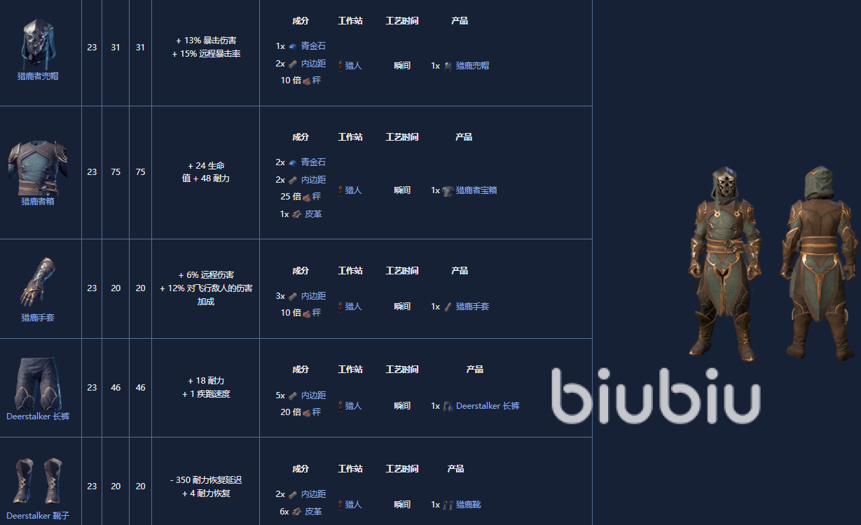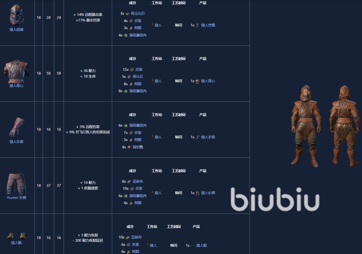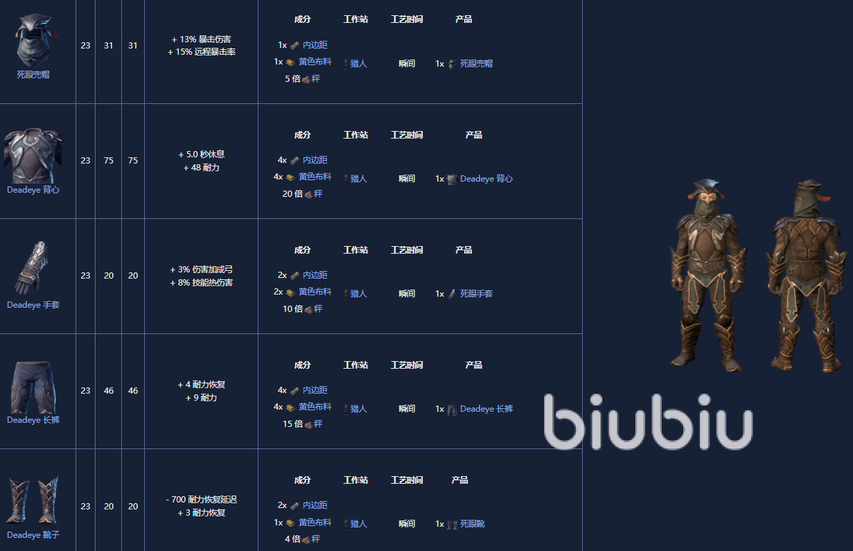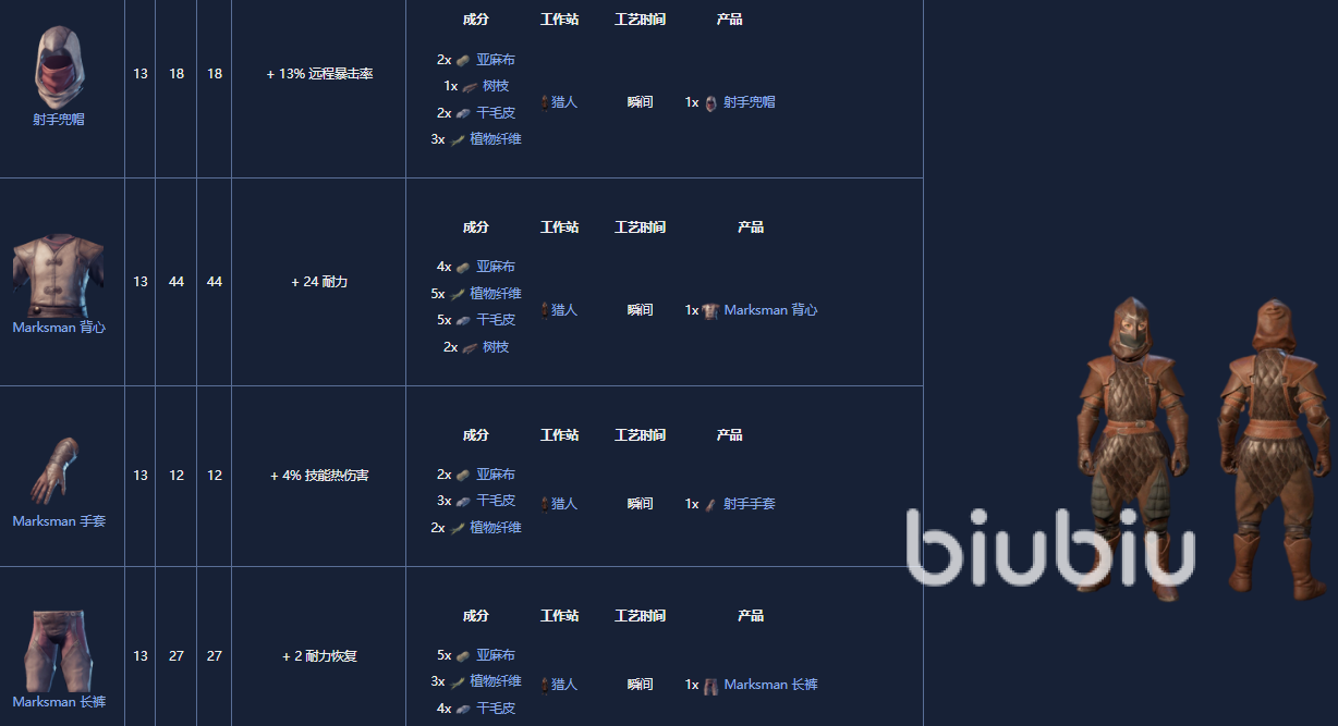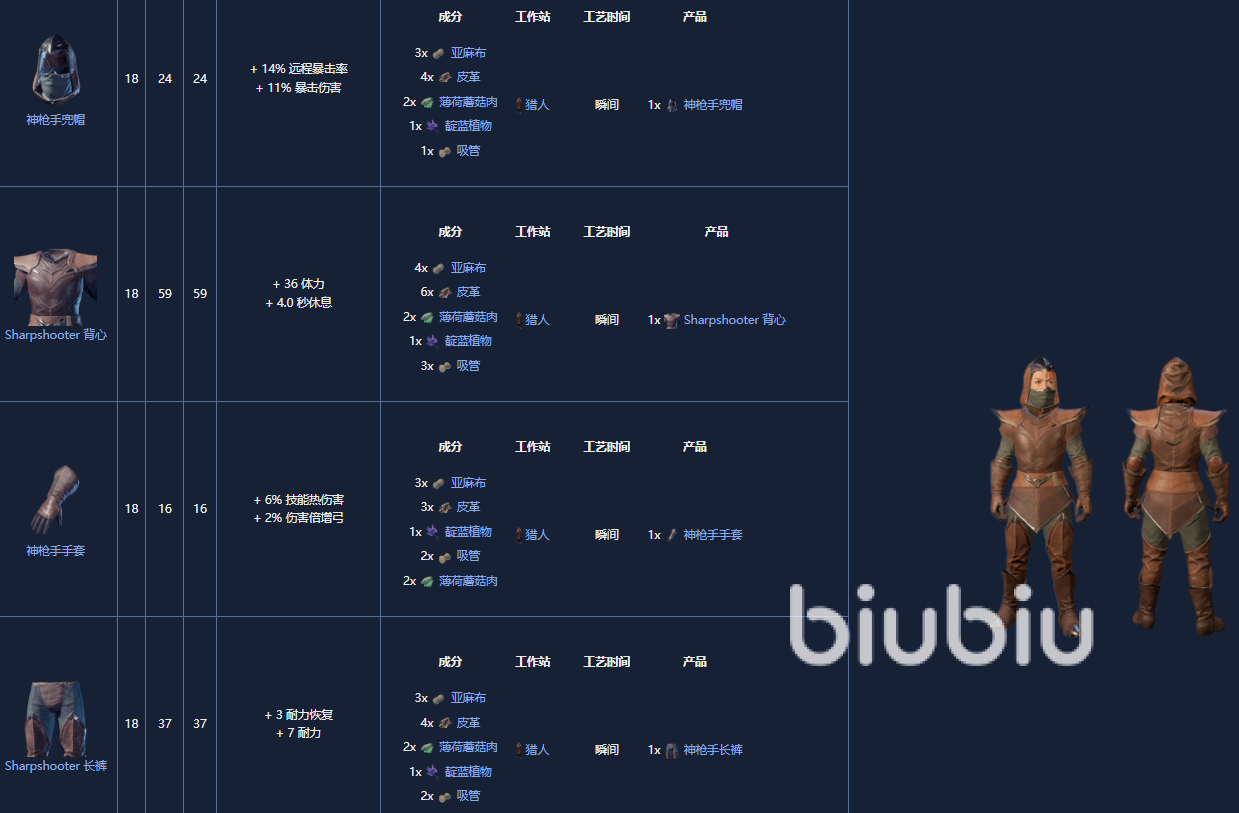 5. 神枪手套装,18级,制作需要一个晒黑站。
