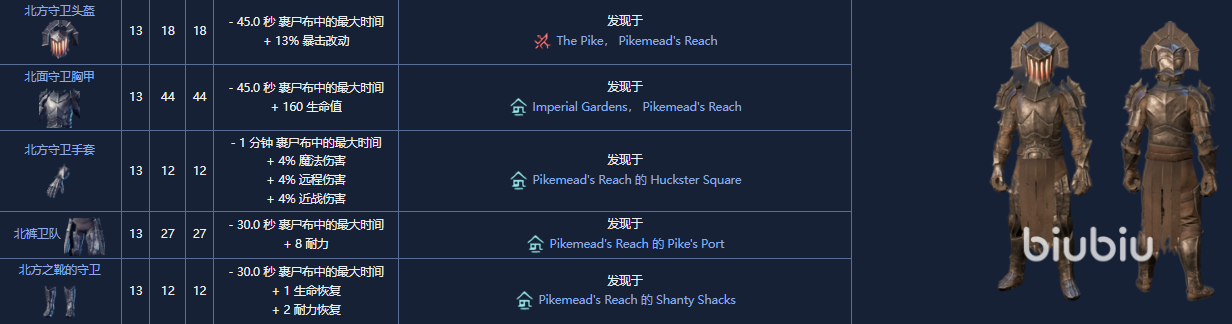 6. 北方守卫套,13 级盔甲套装,可以从Revelwood 的 Pikemead's Reach 周围的五个独特的金箱中获得。