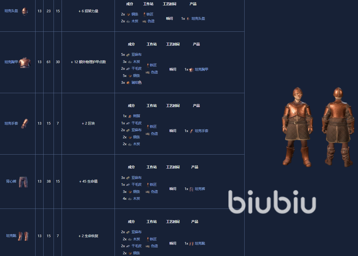 5. 坦克套,是一套13级的盔甲套装,如果已经放置了熔炉,可以由铁匠制作。它河以通过首次获得铜定或坩埚来解锁。