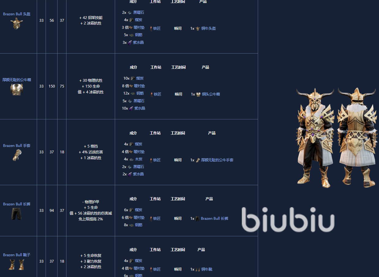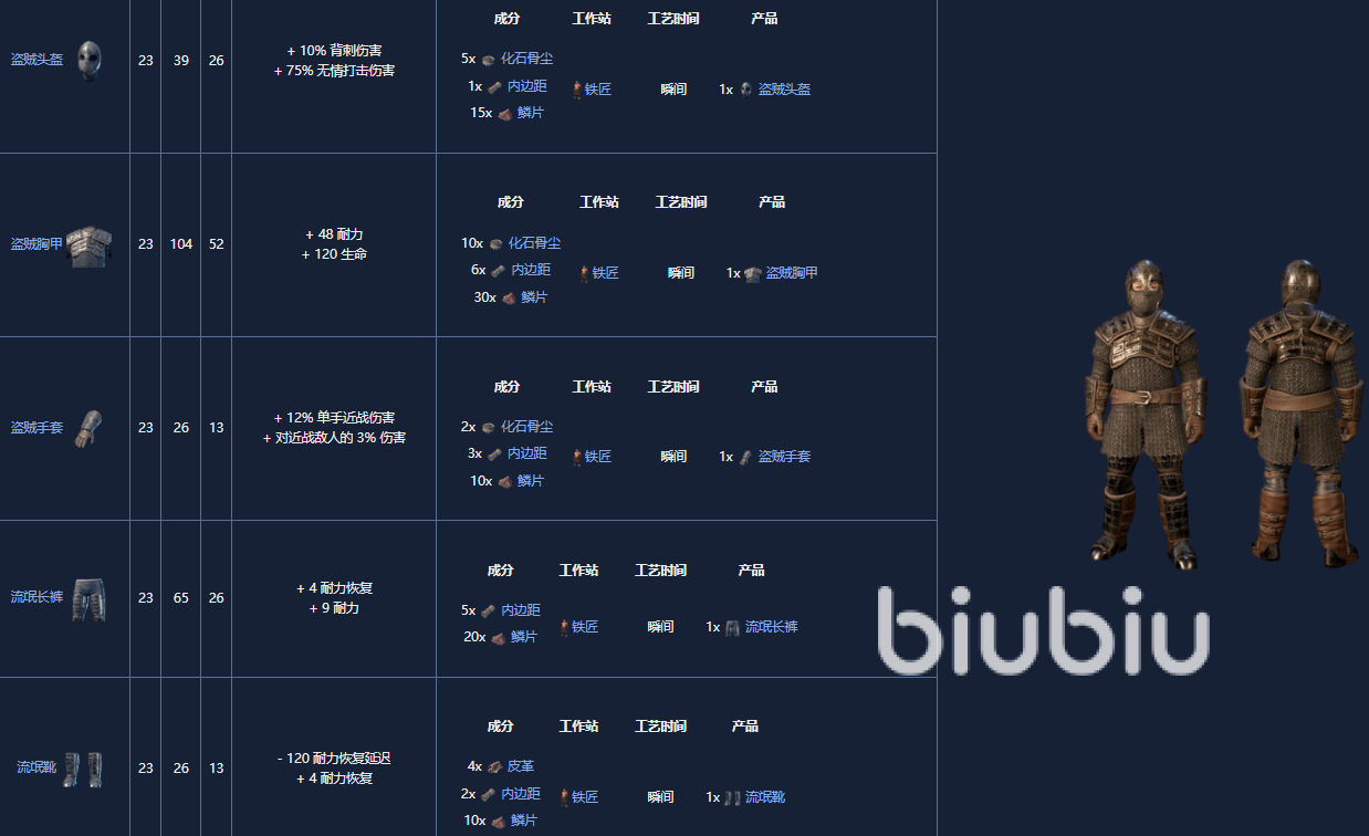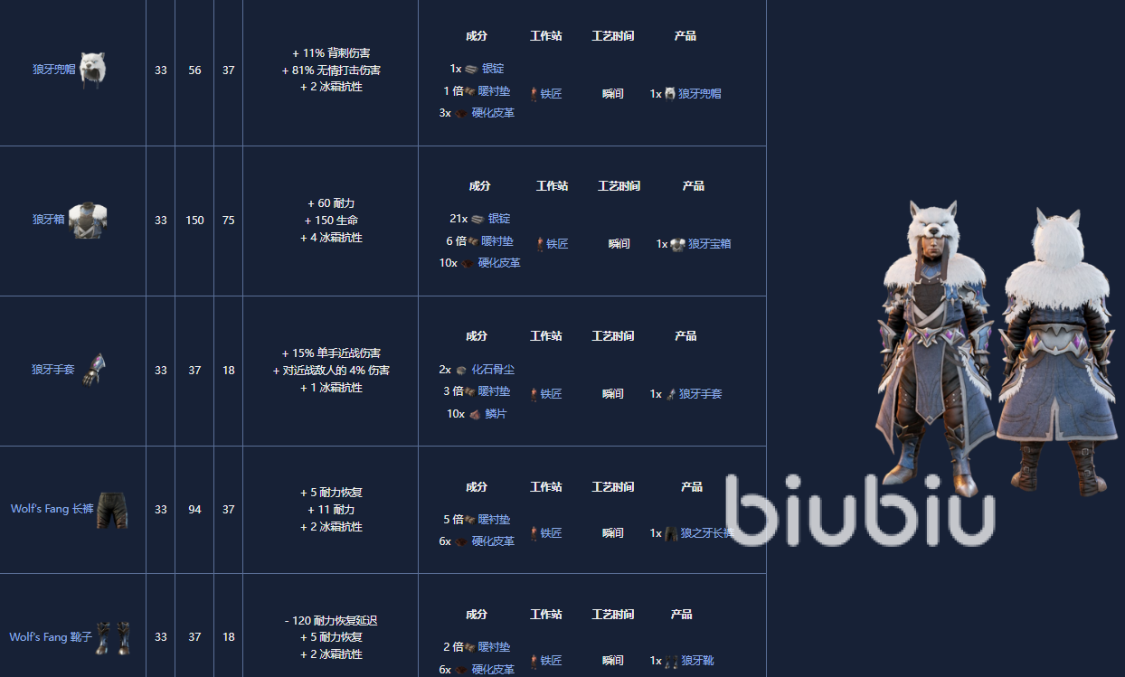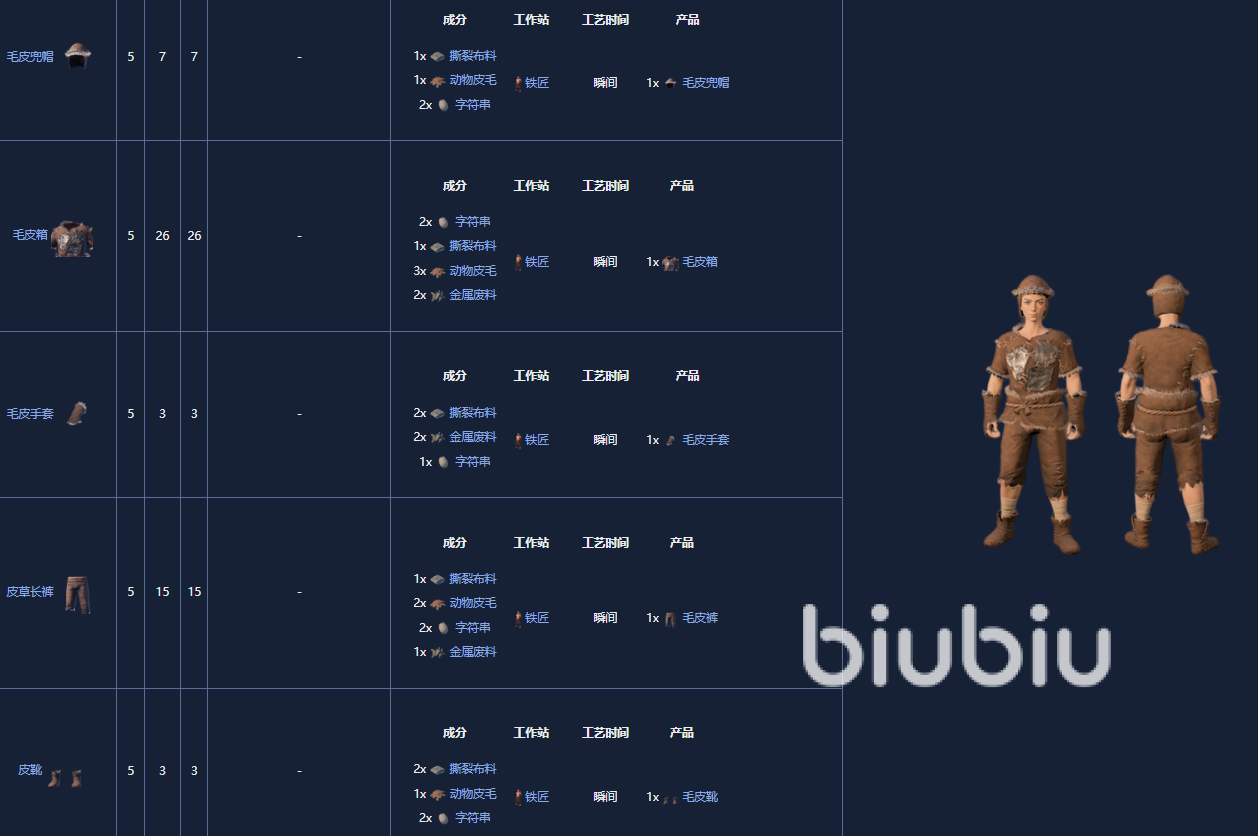 1. 毛皮盔甲套装,5级,可以由铁匠制作。
