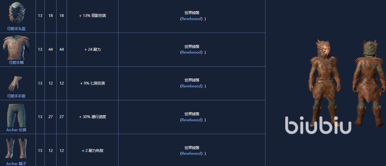 4. 弓箭手套,是一套13 级盔甲套装,可以从Revelwood的宝箱或Boss中随机获得。