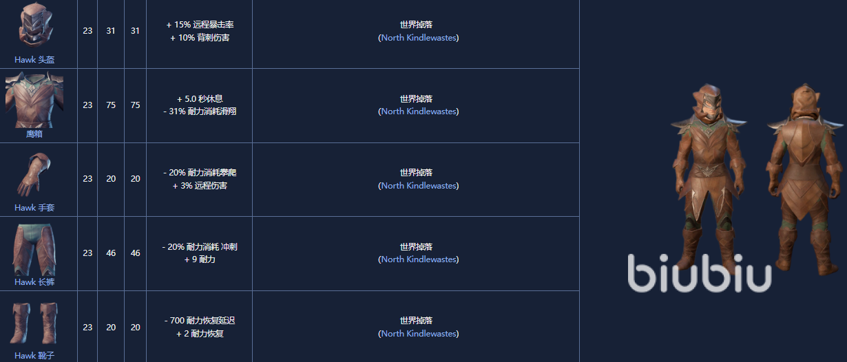 11. 鹰集套装(Hawk Set)是一套23 级的盔甲套装,可以从北方 Kindlewastes 箱子中获得。