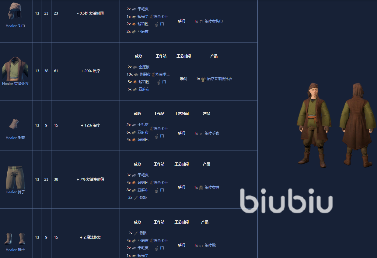 3. 治疗者套装,也是13级,制作需要迫击炮。
