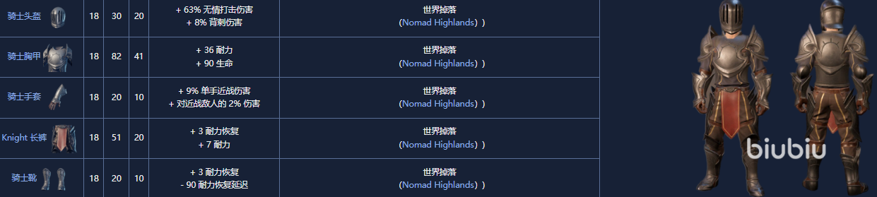 9. 骑士套装,18级,可以从Nomad Highlands 的可掠夺宝箱或 Boss 中随机获得。