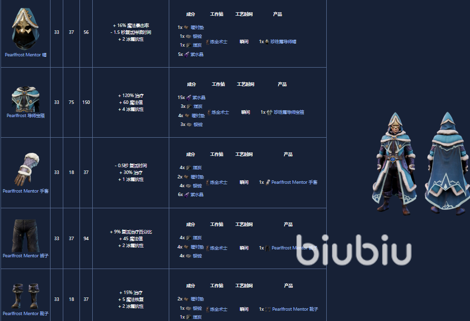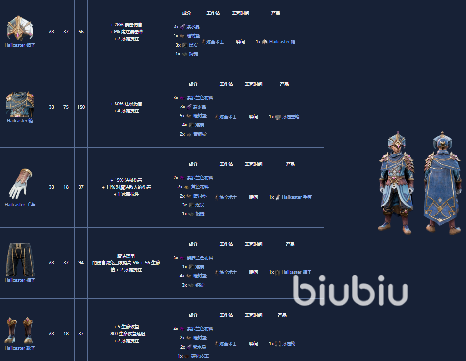 13. 冰雹施放者套(Hailcaster Set),是一套 33 级护甲套装,可以由炼金术士制作。
