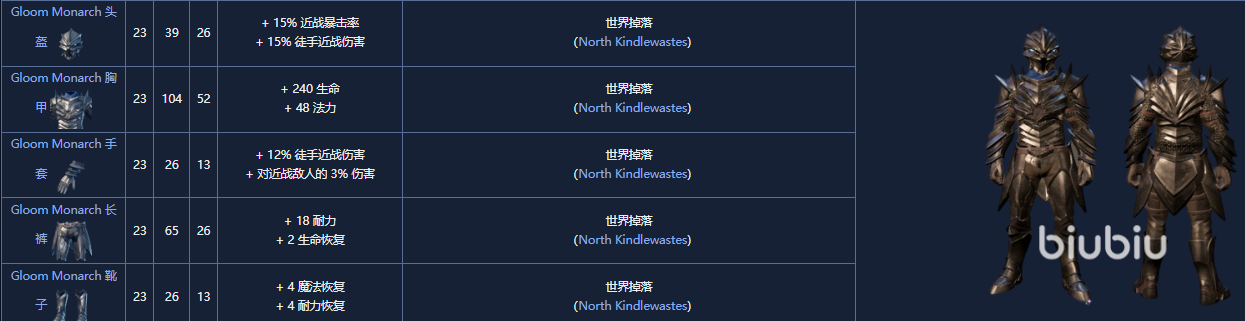 13. 黑暗君主套,23级,可以从北方Kindlewastes的可掠夺箱子或 Boss中随机获得。