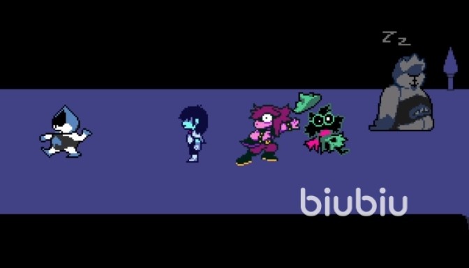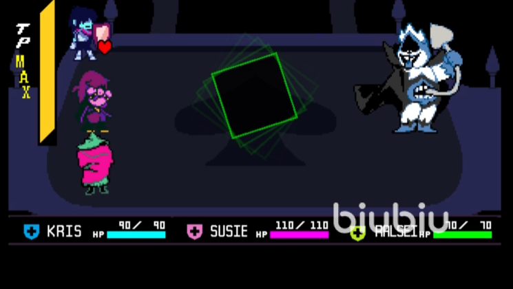 到了我们的环节,使用天旋地转或者是kris的勇气来攻击怪物都可以的。如果能够带上恶魔飞刀等武器,伤害量高了打的也会快点。等血量耗的差不多,差不多十个回合,国王就会进入疲惫期,治疗它之后国王反过来攻击我们,好在这时候可以用安抚法术催眠他,饶恕他,国王睡着后走剧情之后就完成这个关卡。