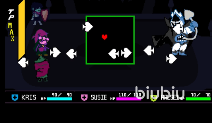 我们在战斗的时候,是可以选择暴力线路或者是和平线,它们的区别就是最后的决定不同。前期打法一样,在国王的回合他会召唤黑桃来攻击玩家的灵魂,也就是红色的小爱心,需要操作灵活点躲开。