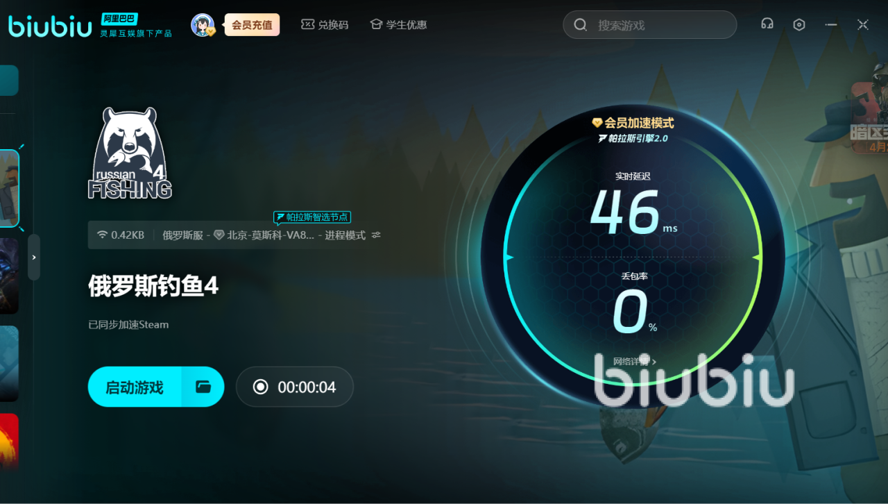 由于俄罗斯钓鱼4属于一款闻名遐迩的海外佳作,所以暂时仍然没有上线国服。为了能够来到这个世界钓鱼,大家用上biubiu,加速过后才能注册自己的账号,开始真正的钓鱼人生。对于新用户来说,注册之后就可以获得24小时免费加速。另外新老用户输入兑换码【biubiu不卡顿】,就能额外获得三天免费加速。要是钓鱼途中过卡的话,很容易让大鱼脱钩。所以要借助加速器,才能准确钓到每一只不同品种的鱼。