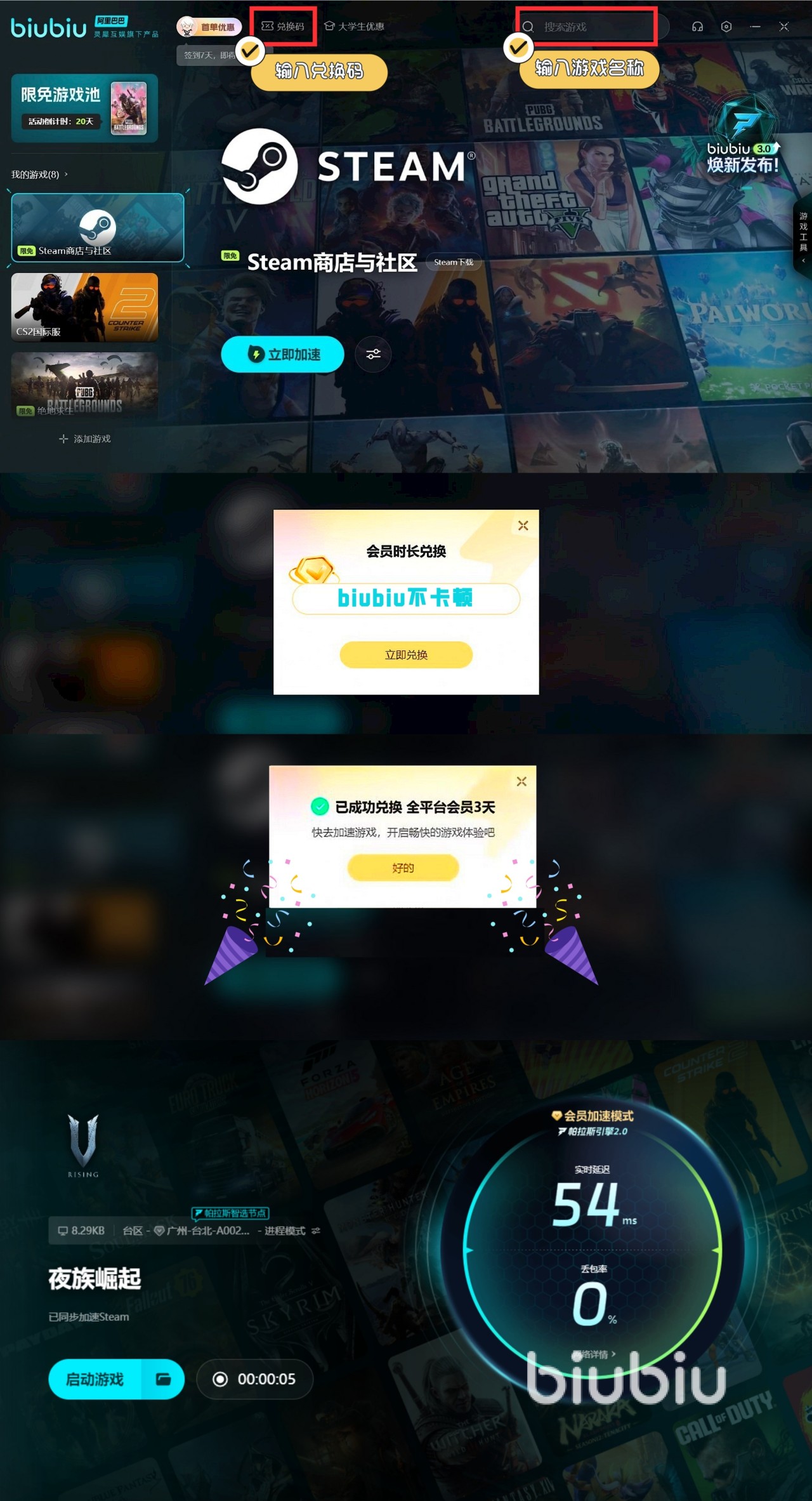 若是玩家到时希望能去解锁更多加速时长,还可借助口令【biubiu不卡顿】来帮自己,如此所有平台用户均可领取到72h的加速机会,助力玩家去长时间体验,而不用担心会有要求充值等问题发生。