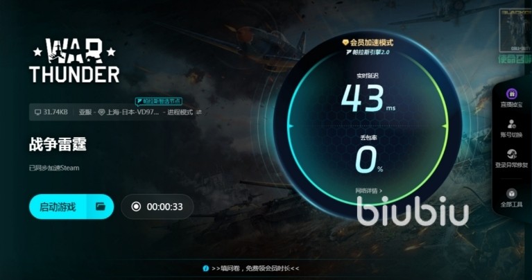2025年05月06日 22:12 来源:补兵却喇叭芽作为一款载具射击玩法的作品,其中所带来的武器种类丰富,更是高度还原历史题材,有着多元化的战斗体验给到大家,丰富的战术选择让玩家的 体验感变得更强,本期主要是来介绍战争雷霆国际服加速器,若是朋友们到时想要让自身的网络有个稳定的加速环境,那么去主动来选择biubiu帮自己就很是不错,近期有想法就一起来看看吧。