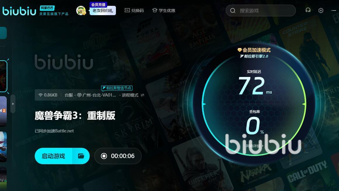 biubiu加速器通过全球专线加速与智能进程优化,可突破区域限制实现秒速加载,魔兽争霸3重制版将四大种族的兵种碰撞提升至全新维度,人族骑士的冲锋轨迹、暗夜精灵古树的年轮纹理都经过电影级渲染。在净化斯坦索姆等经典战役中,玩家需要精确把控食尸鬼集火时机与死亡骑士走位,这对网络延迟提出严苛要求。biubiu加速器针对重制版特性开发了专门的加速入口,能提升战役加载速度。如果你感觉biubiu还不错,那么不妨现在就去体验,现在作为新用户注册,就能领到24小时加速时长,所有用户输入兑换码【biubiu不卡顿】可以获得三天加速时长,有了免费试用的时间,你就能耐心地体验biubiu加速器了。