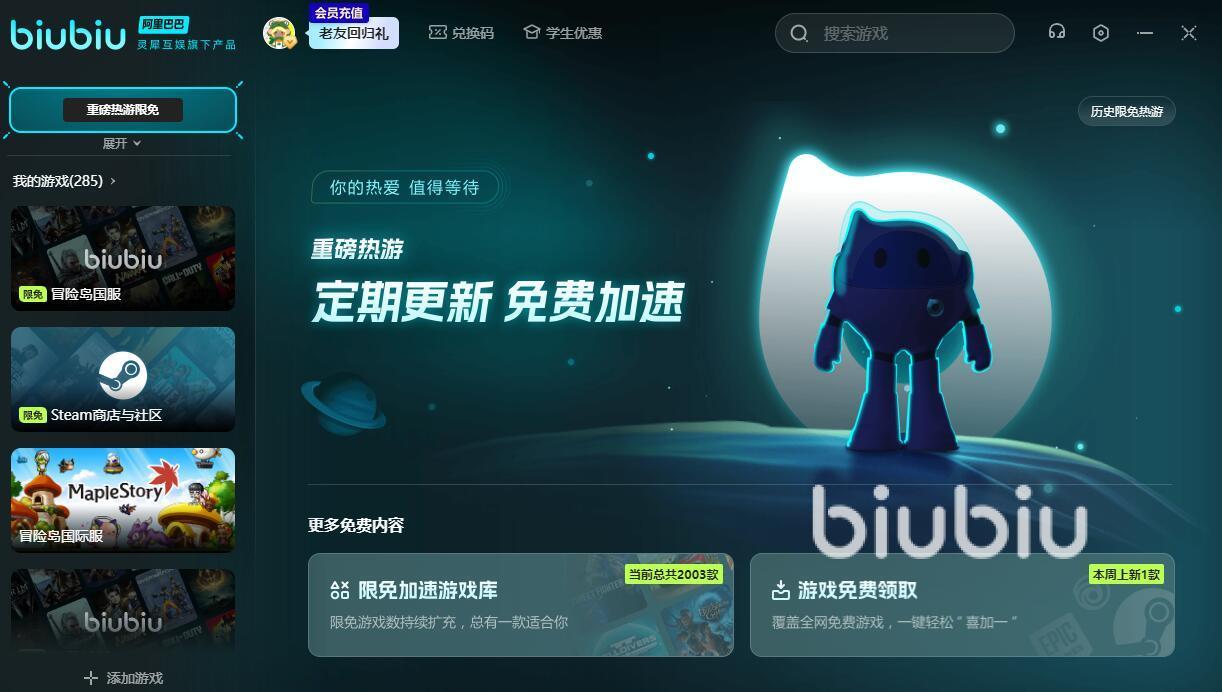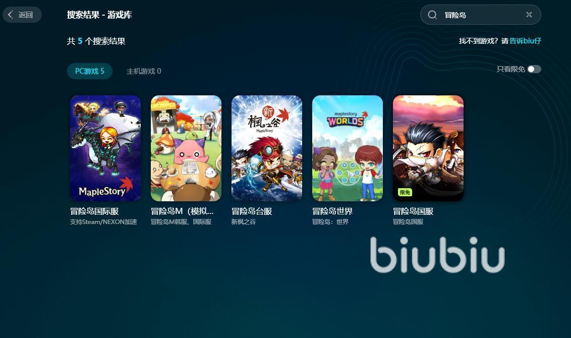 成为会员之后,无论游玩哪一个版本的冒险岛,都能享受到同样的加速服务,除了冒险岛之外,平台还支持很多热门的网游,大家可以用biubiu去优化它们。此外,平台还上线了限免活动,凡是在限免范围内的游戏,不开会员也能加速,让大家有更多时间去体验biubiu这个软件。