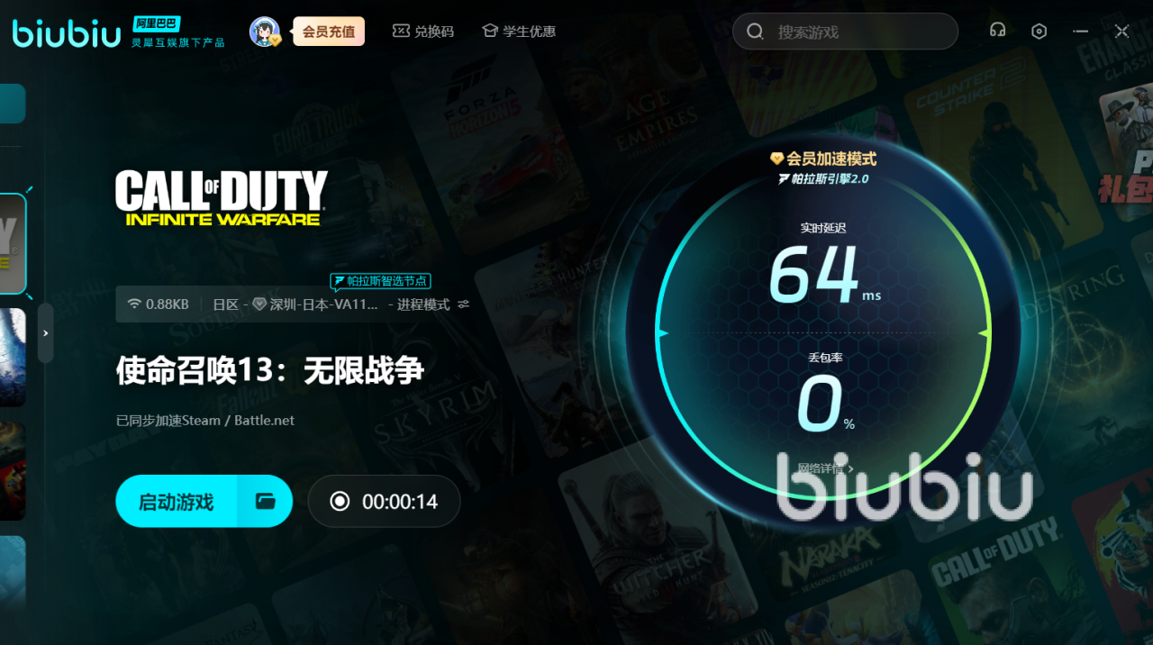 使命召唤13作为一款全球知名的射击大作,目前暂时仍然没有上线国服。所以为了在国际战场中射杀各种对手,大家就要用上biubiu;加速后才可进行灵活空战,与海外网友一同对抗。对于刚注册的新用户来说,可领取24小时的免费加速。另外新老用户通过兑换码【biubiu不卡顿】,即可额外获得三天免费加速。要是在驾驶战机的途中太卡,那就无法灵活操控,很容易被敌人击落。用上加速器后,就能灵活驾驶战机。