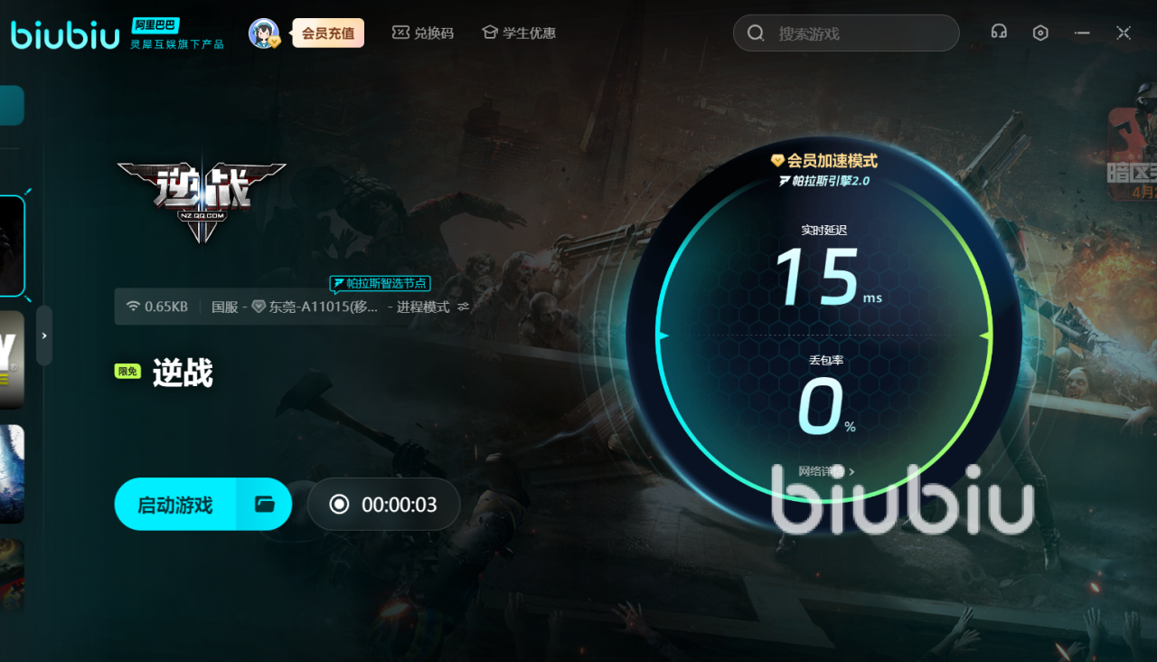 《逆战》是一款热血刺激的国产FPS网游,主打PVE合作射击和机甲对战,玩法超多样!要是在进行pve作战时延迟高,那就无法和队友配合好;用上了biubiu,就可以一起打好配合,并拿下胜利。在最经典的猎场模式里,4人组队刷僵尸,挑战Z博士、尸龙等BOSS,爆装备爽翻天;塔防模式要和朋友摆陷阱、守防线,切割机、速冻箱等黑科技陷阱玩出花样策略。喜欢刚枪的可以玩机甲战,驾驶暴风、巨兽机甲对轰,或者在新PVP模式里公平竞技,大家还能在猫鼠大逃杀中变“鼠星人”溜猫。
