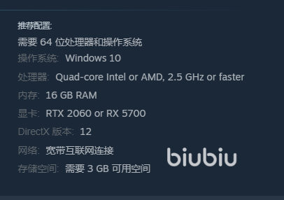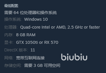 现在steam上面是已经可以查找到它了,官方也公布了系统需求,我们需要拥有2.5GHZ的处理器,版本低点也能带得动。然后显卡的要求是高了一点的,最低也要有GTX1050ti的级别,内存条有8gb就行了,存储空间很小,需要有3gb,满足起来还是比较容易。