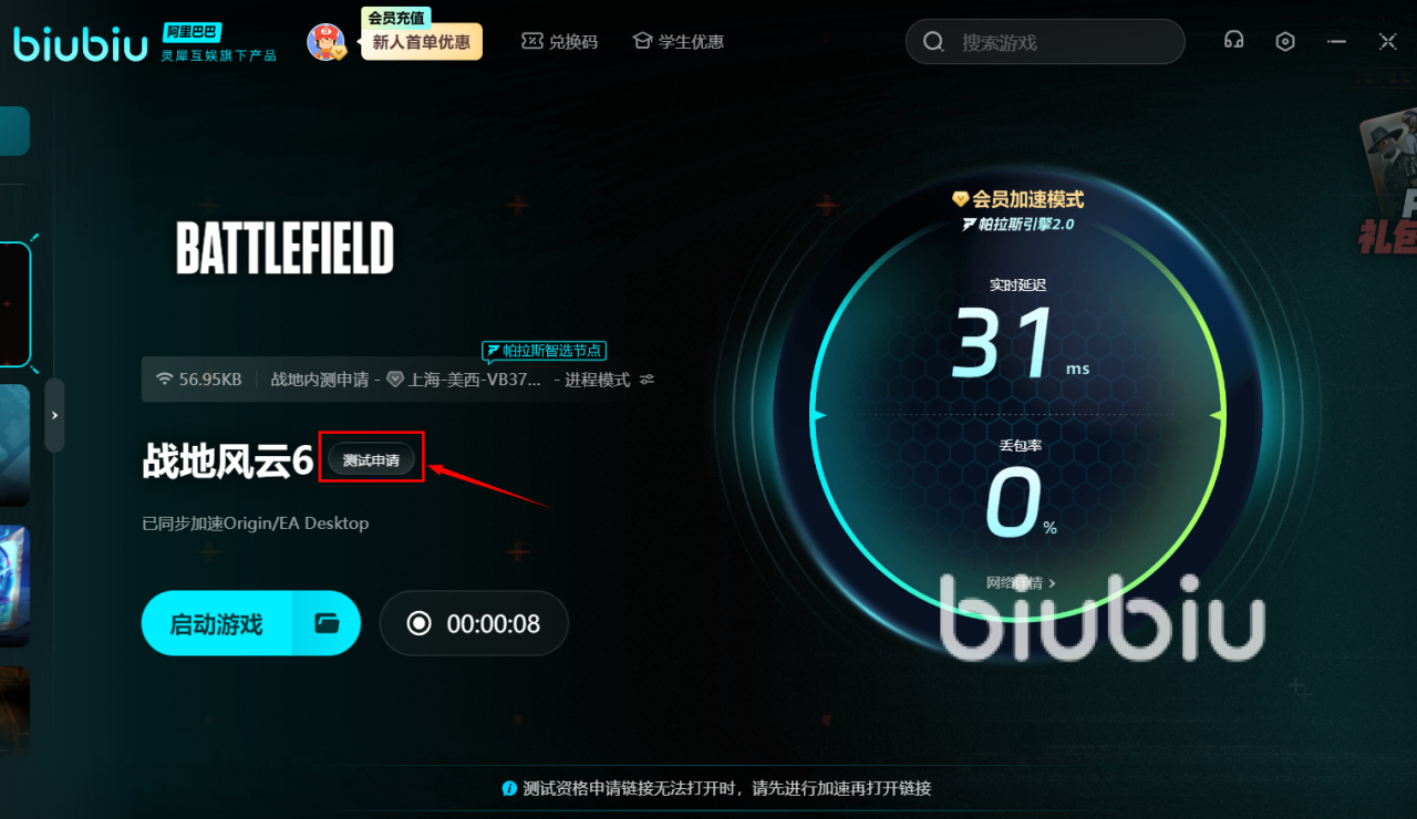 战地新作的本轮测试,首次开放中国地区参与(需在问卷中勾选“中国”),因此无需连接VPN了,但注意仍然需要加速器以稳定的连接官网。若是有不清楚官网链接的小伙伴,建议直接打开biubiu加速器客户端,然后搜一下“战地6”就能直达该游戏的加速页面了,下图标识的地方就是申请网址。