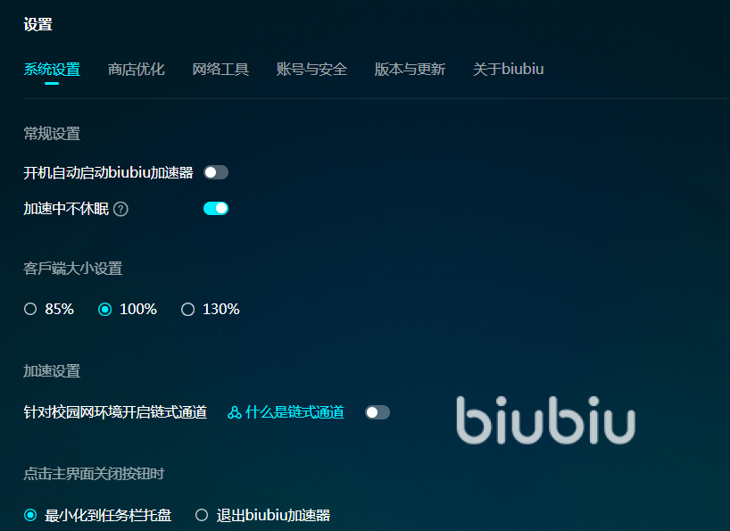 除了加速游戏以外,biubiu还有其他功能哦,比如优化游戏商店、解决各大游戏平台无法登录、加速失败等问题,这些功能在设置里面就能找到。biubiu还有人性化系统设置,用户根据自己的视觉习惯来调整客户端大小,以及决定最小化客户端以后是否关闭客户端,用起来方便又贴心。