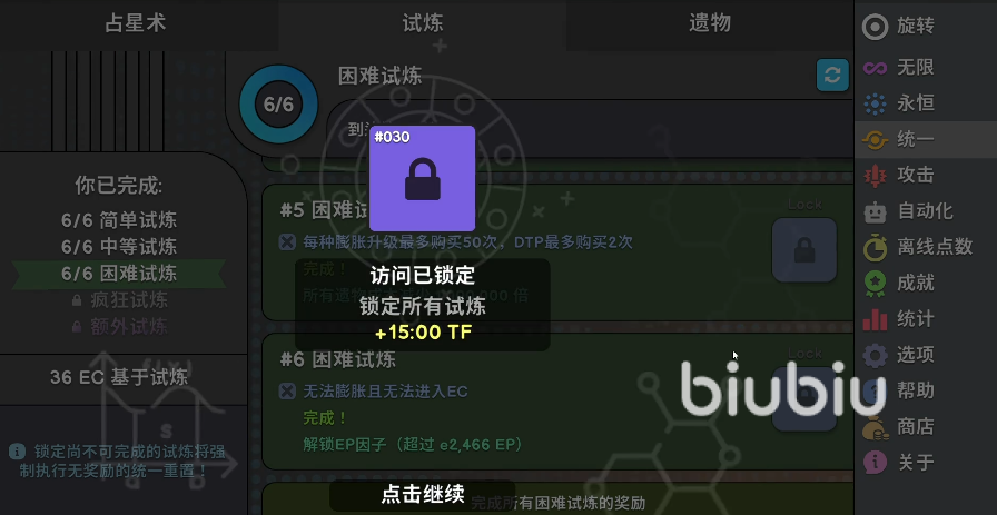 解法:禁用所有自动化→进入永恒挑战10-5→进入膨胀(Dilation)→进入无限挑战9→点击无限按钮。