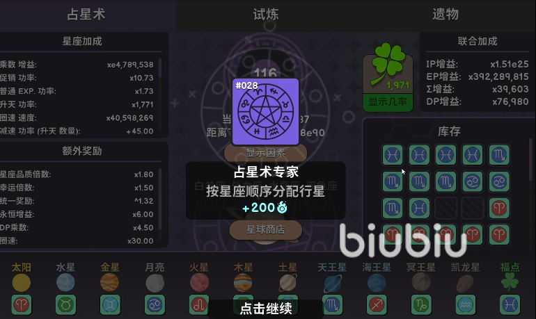 解法:在星辰阶段的无限升级中仅购买顶行(X;1),直到21;1节点。