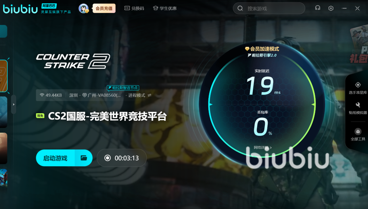 biubiu加速器的福利更是诚意满满!现在新用户注册即可免费领取24小时加速时长,无压力体验流畅对战;输入【biubiu不卡顿】的兑换码,新老用户们还能额外获得三天加速体验时间,足够你在战场上尽情挥洒汗水!登录平台后,简洁直观的界面一目了然,搜索栏中输入搜“CS2”,一键点击加速,轻松开启。