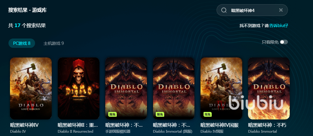 biubiu是专业的游戏加速器,深受上亿用户的支持和信赖。它里面有很多游戏资源,暗黑4就是其中之一,只要搜索游戏名就能找到加速资源。平台收录了暗黑破坏神各个系列,玩暗黑4的小伙伴只要点击暗黑4的加速键就能启动加速,它能带来流畅的网速,让大家玩游戏不再卡顿,一口气玩个痛快。
