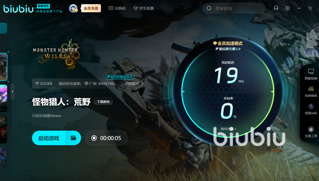2025年05月09日 17:38 来源:白银向大蛇丸怪猎的全称叫做怪物猎人荒野,是很好玩的rpg动作游戏。要是怪猎闪退怎么办?一旦闪退的话,大家的拓荒之旅就要就此结束了。所以为了塑造更良好的游戏环境,大家最好借助biubiu;加速过后自然能安稳地运行下去,即便挑战更加强力的怪物时,也可以慢慢的消磨对方的血量,不用担心突然闪退。