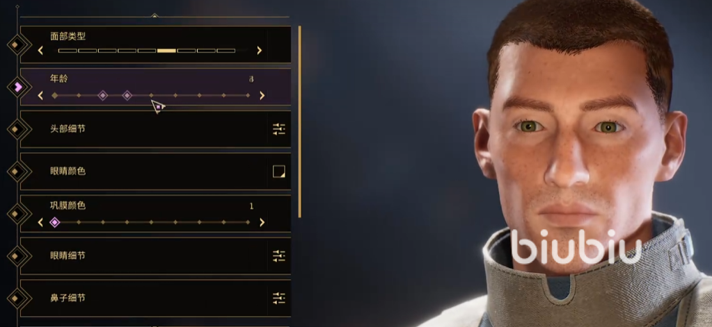 接着就是细节部分了,面部肯定是需要捏的自己喜欢的,年龄调整之后,就可以改变皮肤状态。然后我们选择头部细节,来更改颅骨的外观,偏向于圆润会更好看。