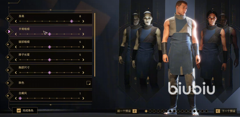 然后就可以更改细节了,体型肯定是最先需要调节的,像是身高,手臂粗细等等,都可以按照自己的身材审美去捏造角色,一般男性选择微微健壮饱满的肌肉,女性拥有力量感,角色身材就很好看了。