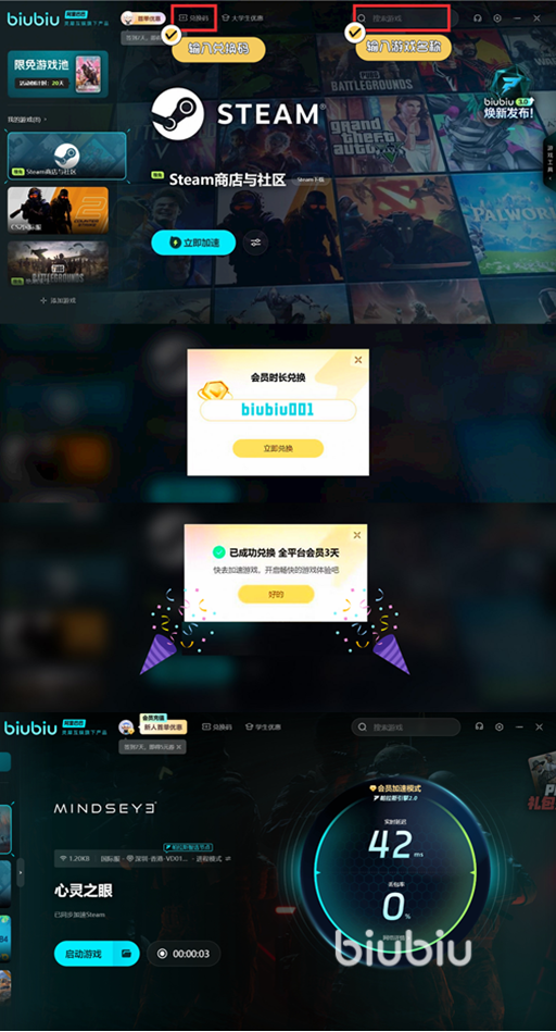 在有了加速器的帮助之后,下载的速度就可以得到保障,不需要担心下载时的卡顿。现在新用户点击以上的链接完成下载之后,首次登录还有24小时的礼包。兑换码【biubiu001】可以在原本的基础上又额外的延长三天,这一个兑换码所有的用户都可以使用,而如果是用户用两种方法,那就可以免费长达96小时。