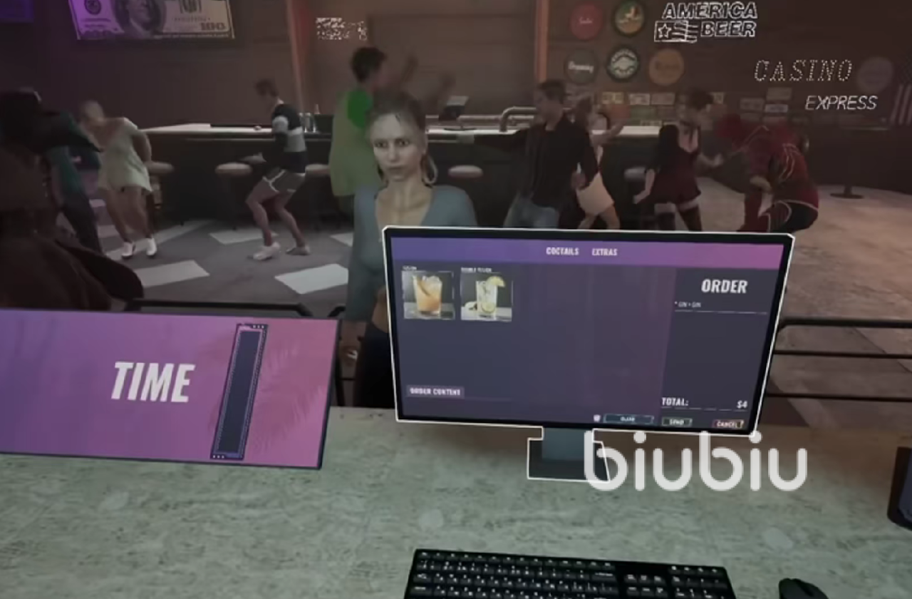在游戏中调酒系统特别的真实,玩家进入游戏之后会来到吧台区域,这时候就能够选择调酒的功能。一旦玩家进入到调酒模式中,会显示基酒,果汁,糖浆等等原料。这时候玩家就需要根据顾客的需求或者是配方提示,按照对应的比例开始调整。