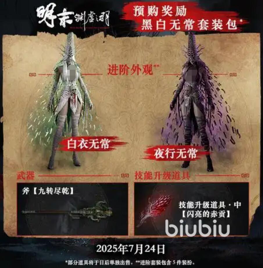 现游戏已于2025年4月29日正式开启预购,并定于7月24日登陆多平台本次预购不仅提供标准版与豪华版选择,还附赠丰富的限定奖励,为玩家提前解锁独特外观与强力装备。预购标准版的玩家可获得“黑白无常套装包”,包含两套强化服装“夜行无常”与“白衣无常”,每套均由5件部位装备组成,大幅提升角色属性。奖励还附带斧类武器“九转尽焚”与中级技能升级道具“晶亮赤汞”,帮助玩家在初期冒险中占据优势。豪华版则进一步扩充内容,追加四套风格迥异的服装(引魂法衣、金虎祥瑞、流云织羽、婉若游龙)及四把专属武器(龙胆亮银枪、赫梯弯刀、龙吟斩月、银星碎玉)
