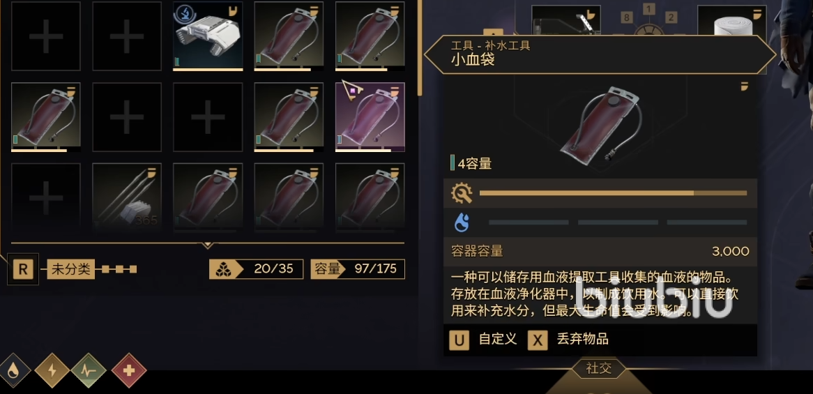 生存刚需:水分通过收集露水植物、抽取敌人血液或净化获得。中后期地图水分消耗速度加快,成为高需求交易品。