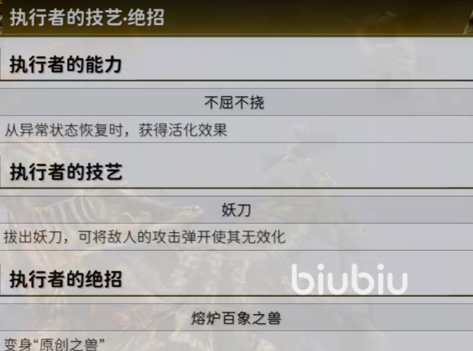 他的能力是不饶,每次从异常状态当中恢复的时候,都会得到强化效果。这个被动能让该角色面对状态技能多的boss时,一直保持高输出,高防御,实用性还是比较强的。不过还是要等实际上线的时候看看坐赐福或者是吃药接触异常的状态会不会触发,如果不能触发那效果就大打折扣了。