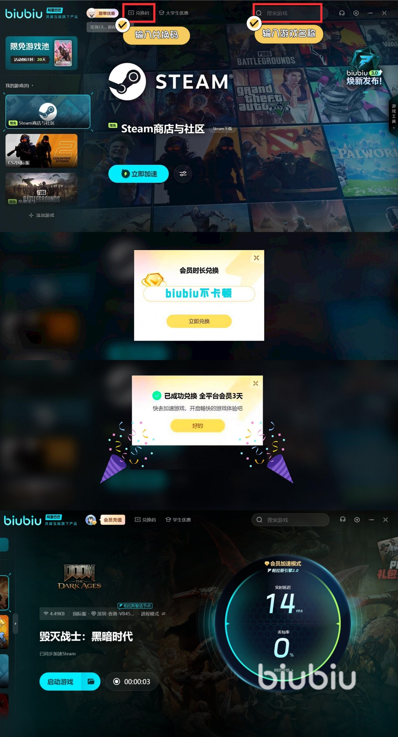 biubiu加速器的福利更是诚意满满!新人用户注册即享24小时免费加速时长,输入兑换码【biubiu不卡顿】,不论新老用户还能额外获得72小时加速时间。新人在双重福利叠加下,可领长达96小时免费加速时间,足够你尽情体验《毁灭战士:黑暗时代》的热血战斗!