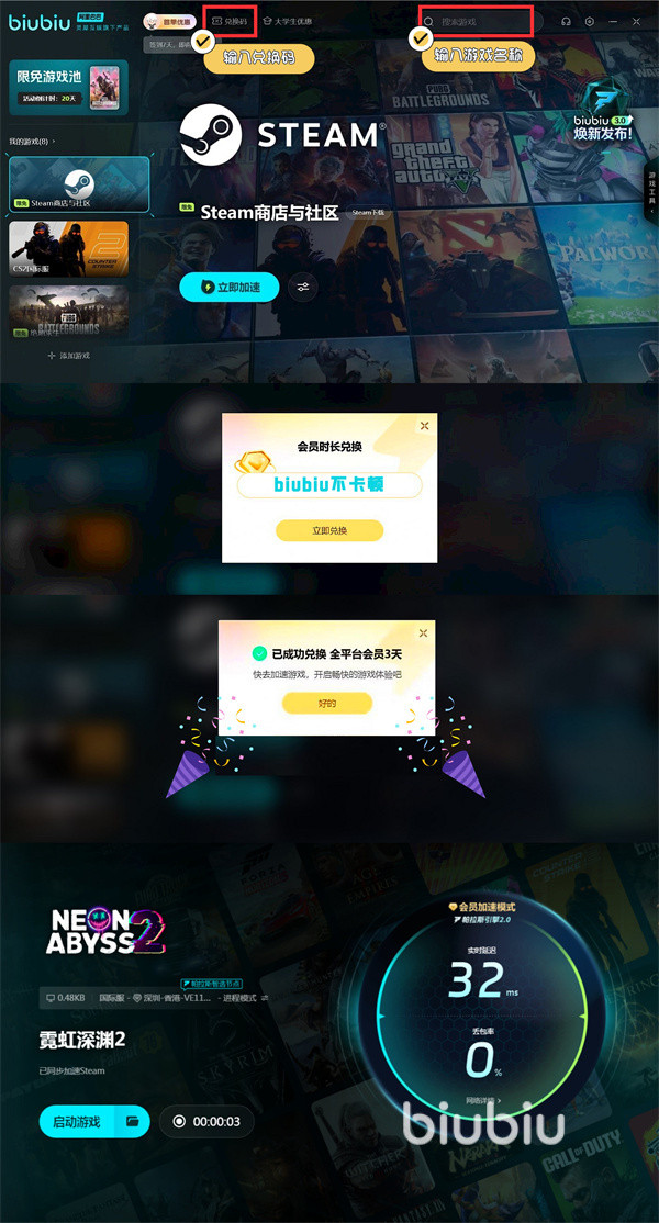 同时想要在长时间联机时,能有个稳定的体验效果,方便自己后续的使用,那么现在还可点击首页兑换,然后利用【biubiu不卡顿】,这样所有平台用户均可领取到72h的加速时长哦,助力各位去长时间体验,而不用担心自身的网络方面会出现掉链子等情况的发生,关键是新用户两者叠加后,共计可获得96小时加速。