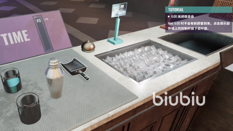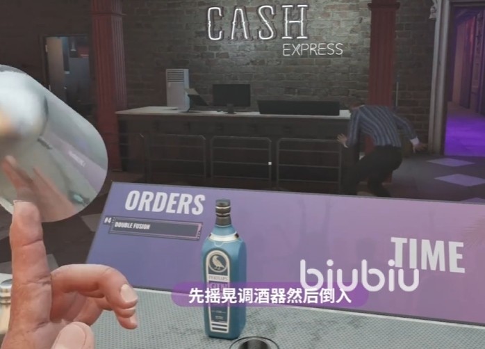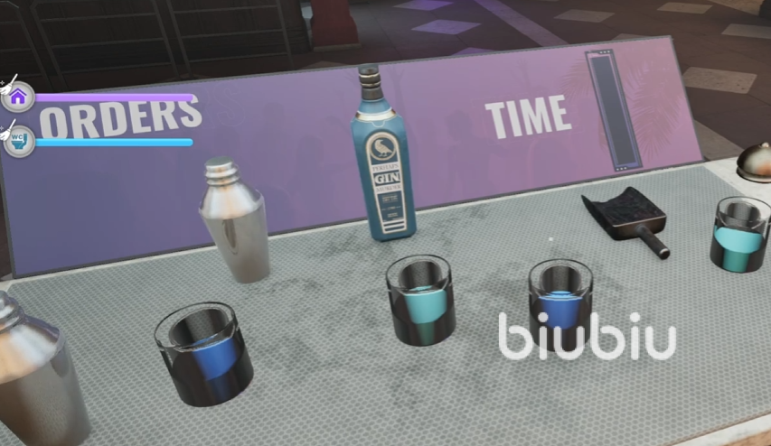 打扫完之后就要进行订货任务了,办公室电脑点点就行了,然后立马去后门取货。稍微难点的就是调酒了,需要每次倒入酒之后都加入冰块摇晃,要是记错了步骤就会得到失败的鸡尾酒,浪费原材料。我们刚开店肯定是要节省一点了,尽量不出错。
